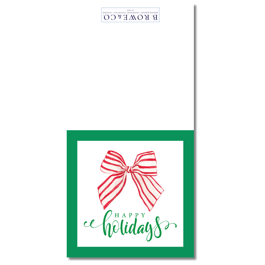 Regular price $15.00Colorful and thoughtfully designed enclosure cards from B. Rowe & Co. are a lovely addition to gifts for friends, family, hostesses, teachers, and more! Our Red + White Bow Happy Holidays Enclosure Cards are new for the holiday season in cheerful red, holiday green, and opens for generous space for a note of good cheer.
