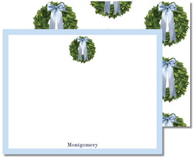 BOXWOOD WREATH + BLUE BOW PERSONALIZED FLAT NOTE CARDS | HAMPTONS HOLIDAY