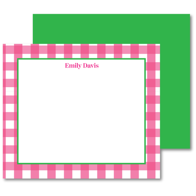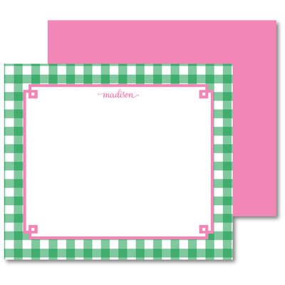 GREEN GINGHAM + PINK PERSONALIZED FLAT NOTE CARDS | PERSONALIZED FLAT NOTE CARDS