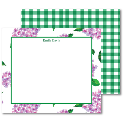 LILAC HYDRANGEAS + GINGHAM PERSONALIZED FLAT NOTE CARDS | PERSONALIZED NOTE CARDS