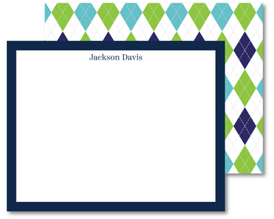 NAVY + LIME ARGYLE PERSONALIZED FLAT NOTE CARDS | PERSONALIZED FLAT NOTE CARDS