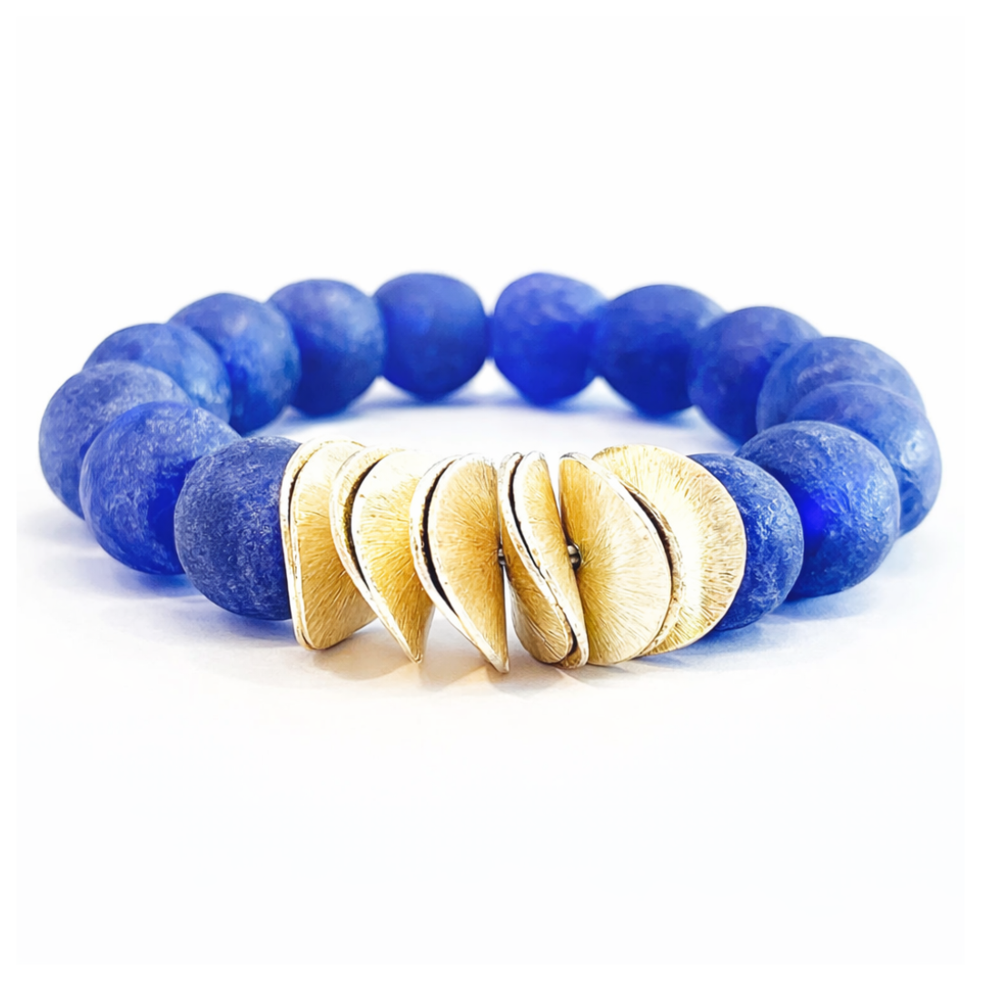 A modern heirloom inspired by coastal summers, patriotic charm, and effortless American style. The Liberty Coast Bracelet pairs softly frosted recycled glass beads in sea-washed blue with bold red accents and sculptural ivory-toned center elements, creating a bracelet that feels equal parts nostalgic and elevated. Warm gold spacer details add polish and dimension, grounding the design in timeless craftsmanship rather than novelty.